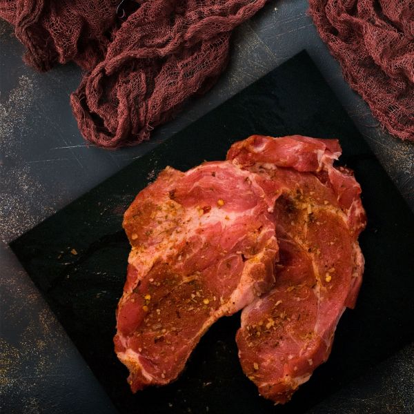 Τρυφερά μπριζολάκια από χοιρινό λαιμό μαριναρισμένα με μπαχαρικά έτοιμα για ψήσιμο.