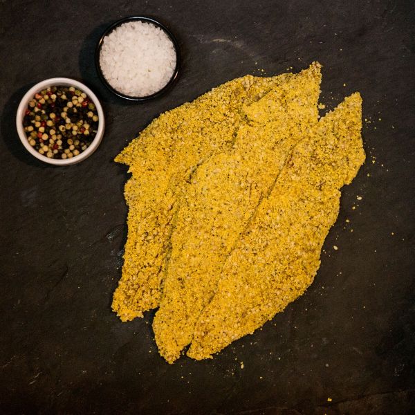 Φιλεταρισμένο χοιρινό μπούτι, χωρίς λίπος, περασμένο από μηχανή σνίτσελ, παναρισμένο.