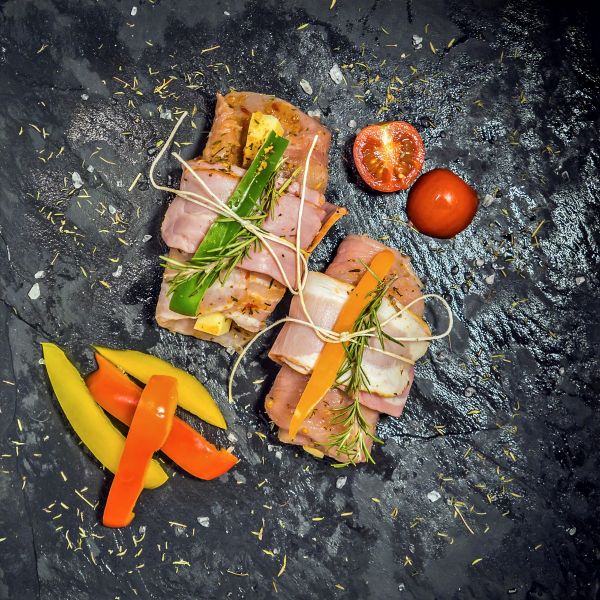 Χοιρινό κρέας με μιξ τυριών, μπέικον και γλυκόξινη σως, τυλιγμένο με μπέικον.